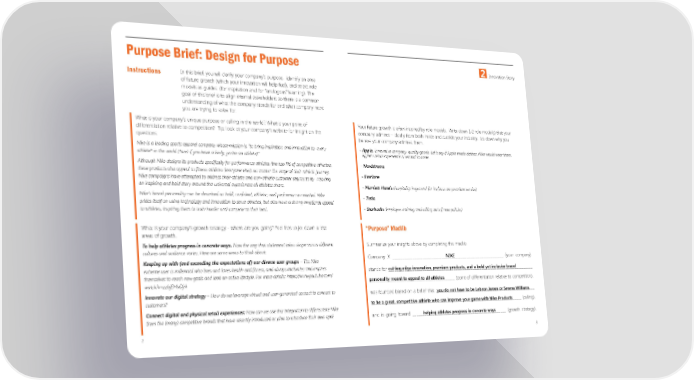 Purpose Brief: Design for Purpose 2 Innovation Story Instructions In this brief, you will clarify your company’s purpose, identify an area of future growth (which your innovation will help fuel), and select role models as guides (for inspiration and for “analogous” learning). The goal of this brief is to align internal stakeholders so there is a common understanding of what the company stands for and what company need you are trying to solve for. What is your company’s unique purpose or calling in the world? What is your point of Your future growth is often inspired by role models. Write down 1-2 role model(s) that your differentiation relative to competition? Tip: look at your company’s website for insight on the company admires – ideally from both inside and outside your industry. Jot down why you questions. believe your company admires them. Nike is a leading sports apparel company whose mission is “to bring inspiration and innovation to every - Apple, innovative company, quality goods. Let’s say if Apple made clothes, Nike would wear them. athlete* in the world (*and if you have a body, you’re an athlete).” Apple’s retail experience is second to none. Although Nike designs its products specifically for performance athletes (the top 1% of competitive athletes), - Nordstroms these products also appeal to fitness athletes (everyone else), no matter the stage of their athletic journey. - Everlane Nike campaigns have attempted to address their athlete and non-athlete customer segments by weaving an inspiring and bold story around the universal experiences all athletes share. - Marriott Hotels (hospitality in general for its focus on premium service) Nike’s brand personality can be described as bold, confident, athletic, and performance-oriented. Nike - Tesla prides itself on using technology and innovation to serve athletes, but also have a strong emotional appeal to athletes, inspiring them to train harder and compete at their best. - Starbucks (employee training and rolling out of new policies) What is your company’s growth strategy - where are you going? Feel free to jot down a few “Purpose” Madlib areas of growth. To help athletes progress in concrete ways. Now the way that statement takes shape across different Summarize your insights above by completing this madlib cultures and audience varies. Here are some areas to think about: Company X __________________________________________________________ (your company) Keeping up with (and exceeding the expectations of) our diverse user groups – The Nike NIKE extreme user is millennial who lives and loves health and fitness, and always motivates and inspires cutting edge innovation, premium products, and a bold yet inclusive brand themselves to reach new goals and lead an active lifestyle. For more details: https://www.youtube.com/ stands for ____________________________________________________________________________ personality meant to appeal to all athletes watch?v=zzbjEMaDjrk ___________________________________________ (point of differentiation relative to competition), Innovate our digital strategy – How do we leverage virtual and user-generated content to connect to you do not have to be Lebron James or Serena Williams was founded based on a belief that _____________________________________________________ customers? to be a great, competitive athlete who can improve your game with Nike Products Connect digital and physical retail experiences: How can we use this integration to differentiate Nike ______________________________________________________________________________ (calling), from the (many) competitive brands that have recently introduced or plan to introduce their own app? helping athletes progress in concrete ways and is going toward _________________________________________________ (growth strategy). 2 3