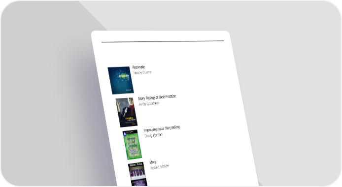 The Power of Story Workbook Page 21 Page 23Resonate Nancy Duarte Story Telling as Best Practice Andy Goodman Improving your Storytelling Doug Lipman Story Robert McKee Made to Stick Chip & Dan Heath We Feel Fine Jonathan Harris & Sep Kamvar 23