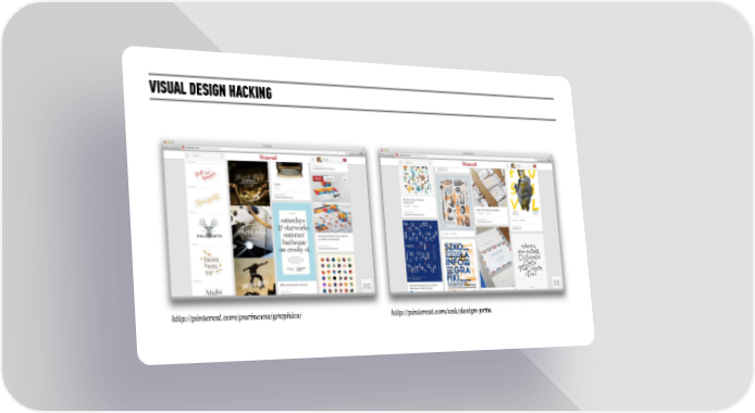 Visual Design Hacking | Storytelling Workshop Page 40 Page 42VISUAL DESIGN HACKING http://pinterest.com/purincess/graphics/ http://pinterest.com/ash/design-pr0n
