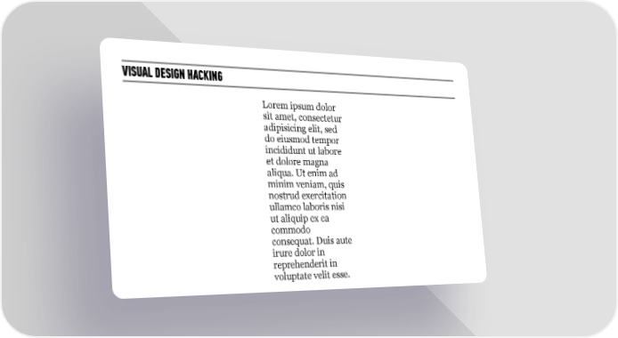 VISUAL DESIGN HACKING Lorem ipsum dolor sit amet, consectetur adipisicing elit, sed do eiusmod tempor incididunt ut labore et dolore magna aliqua. Ut enim ad minim veniam, quis nostrud exercitation ullamco laboris nisi ut aliquip ex ea commodo consequat. Duis aute irure dolor in reprehenderit in voluptate velit esse.