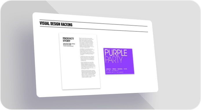 Visual Design Hacking | Storytelling Workshop Page 46 Page 48VISUAL DESIGN HACKING PURPLE PARTY KARAOKE / DRINKS / DANCING / MORE PD LOFT / BUILDING 610 SATURDAY MAY 7TH / 9PM ONWARDS