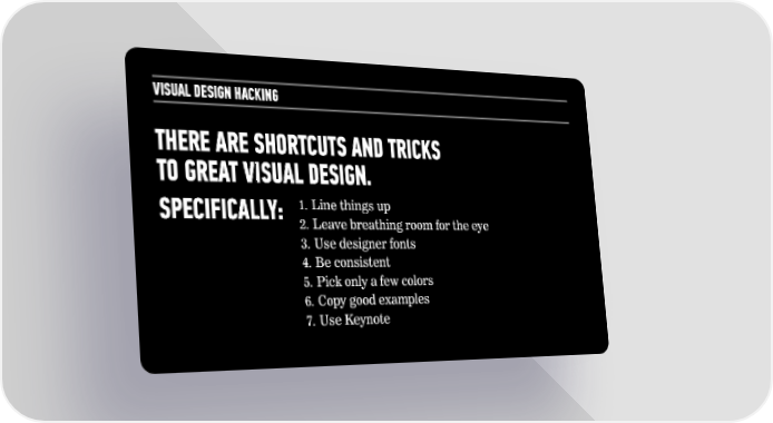 VISUAL DESIGN HACKING THERE ARE SHORTCUTS AND TRICKS TO GREAT VISUAL DESIGN. SPECIFICALLY: 1.Line things up 2. Leave breathing room for the eye 3. Use designer fonts 4. Be consistent 5. Pick only a few colors 6. Copy good examples 7. Use Keynote