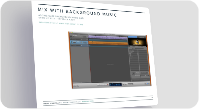 MIX WITH BACKGROUND MUSIC ADDING CUTE BACKGROUND MUSIC AND SYNC UP WITH THE VOICE A BIT GARAGEBAND TO EDIT AUDIO THEN EXPORT TO MP3 VISUAL STORYTELLING PURIN PHANICHPHANT FEBRUARY 2016 20