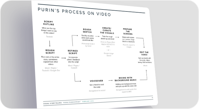 PURIN’S PROCESS ON VIDEO SCRIPT OUTLINE CREATE/ PREPARE What are the top ROUGH CURATE THE things I want to say SKETCH THE VISUALS SCREENS in this video? Quickly visualize Take the rough Stage each screen Textedit what each scene sketch up one level on a canvas. Crop/ would look like Draw on Paper (iPad block as necessary Print script & do it App) or 8.5"x5.5" & Keynote, export to by hand scan images. — or — ROUGH REFINED EDIT THE SCRIPT SCRIPT Google image VIDEO search First stab at the entire Incorporate Sync up visuals with story, sometimes other's feedback the audio. Adjust copied from other into the script timing. Add transitions. videos Word / Pages / iMovie Word / Pages / Textedit Textedit / Google Doc MIXING WITH VOICEOVER BACKGROUND MUSIC Get a friend to read Adding cute background music the script and sync up with the voice a bit Garageband to record Garageband to edit audio then export to MP3 VISUAL STORYTELLING PURIN PHANICHPHANT FEBRUARY 2016 15