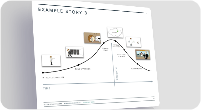 Visual Storytelling Examples Page 11 Page 13EXAMPLE STORY 3 REVEAL SOLUTION CONFLICT PEAKS HERE'S HOW IT WORKS BUILD UP TENSION HAPPY ENDING INTRODUCE CHARACTER TENSION TIME VISUAL STORYTELLING PURIN PHANICHPHANT FEBRUARY 2016 12